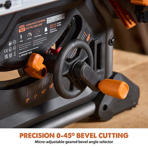 POWERFUL The powerful 15A motor is fine tuned to deliver maximum torque to rip through the toughest materials with ease, while the premium 10” multi-material tungsten carbide tipped (TCT) blade ensures the perfect cut through almost any material you’re working with. The motor features soft start technology to prevent power trips on start-up and an electronic blade brake that stop the blade in seconds. Meanwhile the overload protection actively monitors the motor to optimize performance and prolong tool life.
