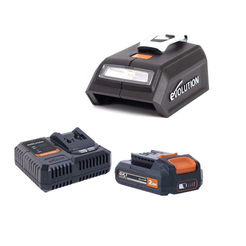 With a convenient built in LED light you'll always be able to see in the dark and get the most possible usage out of any Evolution EXT 2ah, 4Ah, 5Ah or 8Ah battery packs. Leave one in your bag and you'll always have a torch and a charger with you wherever you take your tools.